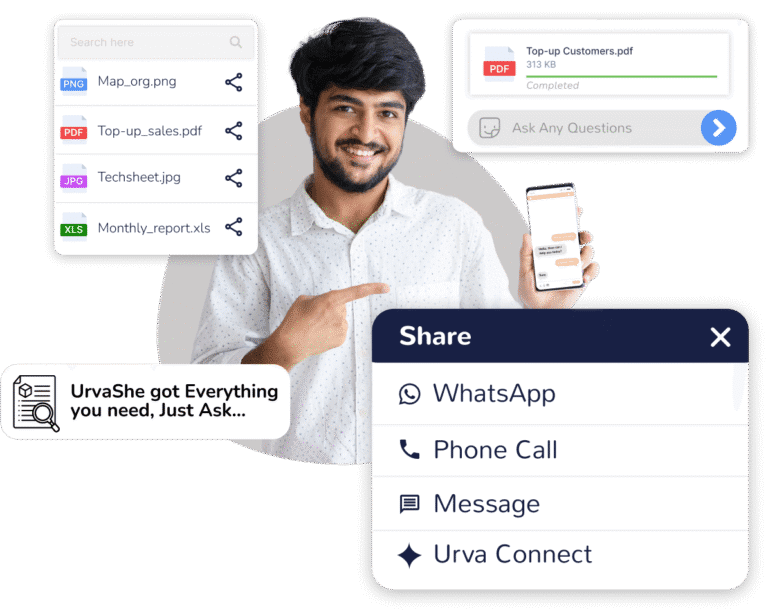 URVAshe learns from your sales process, collaterals, brochures etc. to deliver swift answers about products & services, with instant reference to the source. All you need to do then, is share!